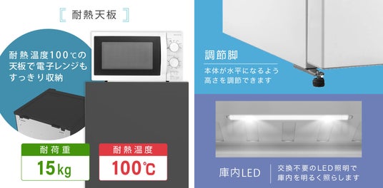 冷気を全体にムラなく広げ、自動で霜取りを行うのでお手入れが簡単な「ファン式自動霜取」、100℃の耐熱温度を有し電子レンジをすっきり収納できる「耐熱天板」、本体が水平になるように高さの調節ができる「調節脚」、冷蔵室内を奥まで明るく照らす「庫内LED」など、日常の使用がラクになる、使いやすさにこだわった仕様となっております。