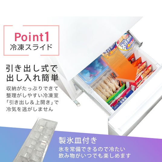 冷凍室は冷気を逃しにくい引き出し式&上開き式の冷凍ケースとなっており、たっぷり収納できる一方で、整理をかんたんに行うことができます。また、製氷皿も付属している為、氷を作っていつでも冷たい飲み物を楽しむことができます。