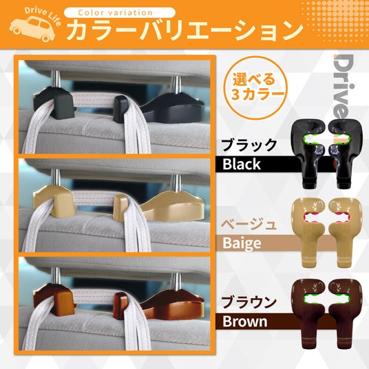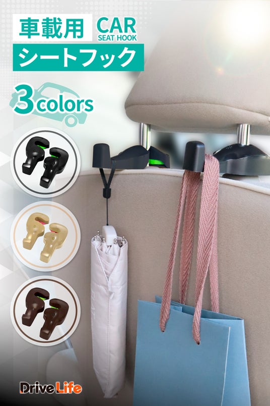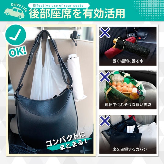 バッグや折りたたみ傘等をフックに掛けるだけですっきり収納・ヘッドレストを傷つけない