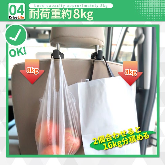 ヘッドレストにフックを装着するだけで後部座席を有効活用!