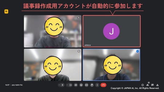 「JAPAN AI SPEECH((TM)) 」とGoogleアカウントを連携させ、GoogleMeetを起動すると、議事録作成用のアカウントが自動的に会議に参加します。