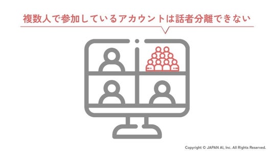 「JAPAN AI SPEECH((TM)) 」は音声波形で話者を識別するため、会議室での発言も話者分離された状態での文字起こしが可能です。
