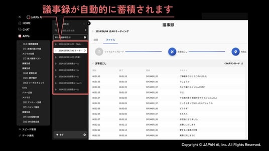 文字起こしは、話者分離された状態で行われ、「JAPAN AI SPEECH((TM))」 に保存されます。