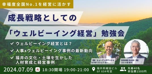 【株式会社ヒューマンポテンシャルラボ(本社:神奈川県鎌倉市、代表取締役社長:山下悠一)】は、成長戦略としての『ウェルビーイング経営』の学びを深める勉強会を福井県で開催いたします。幸福度ランキングで5回連続1位を獲得した福井県を舞台に、心身のウェルネス企業研修を手掛けるヒューマンポテンシャルラボが、2023年に福井県初のTOKYO PRO Market上場を果たし、ウェルビーイング経営を実践するOOKABE GLASSの代表、大壁勝洋氏をお招きし、地域の魅力を活かした経営手法を探求します。