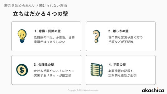 終活への関心度を調査したある調査結果によると、50代以上の人々で終活に関心があると答えた人は7割以上にのぼるものの、実際に終活を継続できている人は約2割にとどまるとのことです。このように終活を始められない、または継続できない理由を調査したところ、4つの壁の存在が明らかになりました。