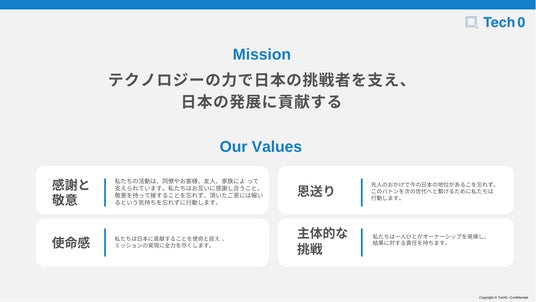 株式会社Tech0は、日本のビジネスリーダーたちにエンジニアのスキルを身に着けてもらい、事業を創り出し、日本に創造と変革を起こしてほしいという想いから生まれました。私たちは「テクノロジーの力で日本の挑戦者を支え、日本の発展に貢献する」というミッションのもと、ビジネスとテクノロジーの両視点から新しい価値を創造する力を育むのテクノロジー版MBA(Master of Buissiness and Technology)、Tech0 Boot Campを運営しております。