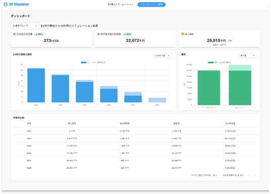 こうした課題を解決するために、「EV simulator」を開発しました。本ツールは、エネルギー事業者様に対しEV移行による効果を詳細に検討可能にするとともに、EVリースや販売を手掛ける企業様にとっても、顧客に対してEV導入のメリットを具体的に提示可能となるため、EV導入促進の支援ツールとしても活用いただけます。