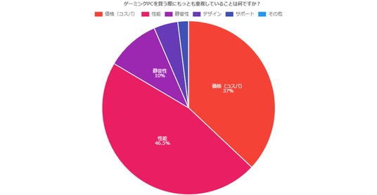 ゲーミングPCを買う際に、ユーザーがもっとも重視するのは「性能(46.5%)」という結果になりました。
