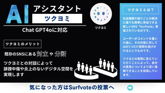 【生成AIの社会実装】社会課題や困りごとの解決に誰でも参加できるSNS「Surfvote(サーフボート)」で活躍中の生成AI「ツクヨミ」がChatGPT4oに対応