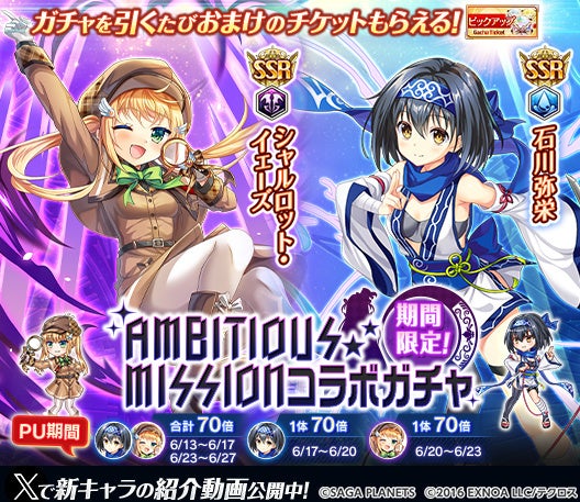 『神姫PROJECT』にて、『AMBITIOUS MISSION』とのコラボ後編を開催!限定コラボキャラとして「石川弥栄」「シャルロット・イェーズ」が登場!
