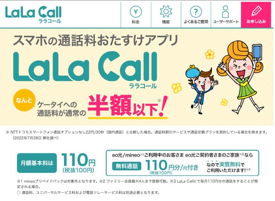 LaLa Callをご利用いただくことで、050からはじまるIP電話番号が付与されるため、LaLa Call間だけではなく、eo光電話や他社050IP番号との無料通話や、固定電話や携帯電話への格安通話が可能となり、スマートフォンからの通話料がお得になります。LaLa Callで通話した際のデータ通信量は、1分あたり約277KBとなり、オプテージが提供する携帯電話サービス「mineo」通信サービスでLaLa Callをご利用いただく場合は、データ通信量が消費されません。