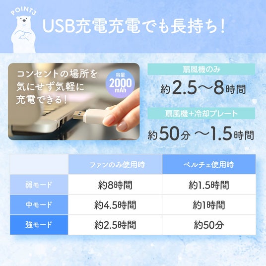 POINT3 USB充電でも長持ち! ファンのみ使用時約8時間(弱モード)