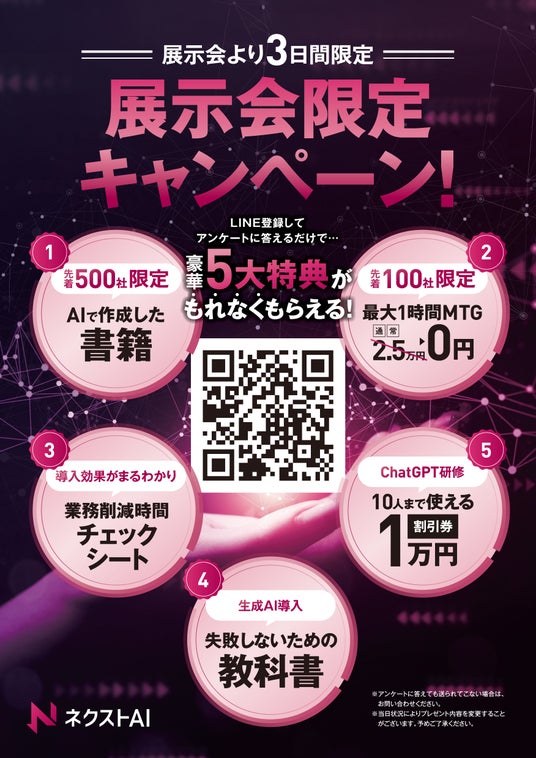 6月11日(火)~13日(木)、東京ビックサイトで開催されました<AI World>に出展し、満足度98.8%の生成AI支援サービス『ネクストAI』をご紹介させていただきました。