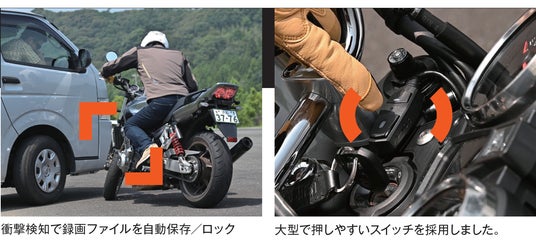 Gセンサーが設定値以上の衝撃を検出すると自動的に衝撃録画データとして記録します。ただし1ファイルの前半20秒以内または後半20秒以内に衝撃を検出した場合、前もしくは後のデータ2ファイルを衝撃録画データとして保存します。また、緊急時や必要なときには、手元のコントロールスイッチを押すことで任意のタイミングで映像を記録することができます。