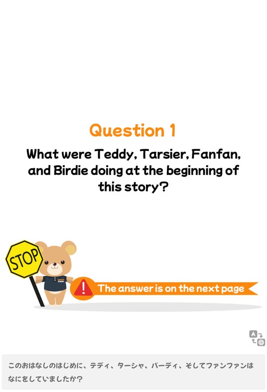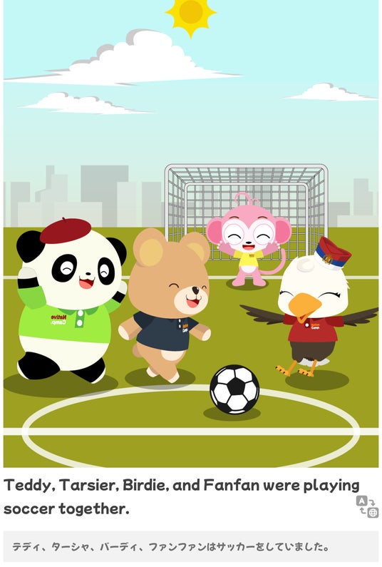 今回リリースした「キッズ - 絵本のえいご」は、楽しいストーリーを通して英語の日常表現を自然に身につけられるお子さま向けのオリジナル教材です。ネイティブキャンプ キッズで人気の「テディ」「ファンファン」などが登場し、かわいい絵本を読みながら英語を学ぶことができます。