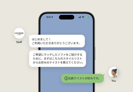 「ソファマスター by RUGHAUS」では、リビング空間のエキスパートがLINE上でブランド横断的な商品提案をすることで、リビングの主役であるソファ選びの手間を格段に簡素化しました。多数の選択肢から候補を絞った上で実物確認ができる店舗に案内されるため、オンラインの手軽さがありつつも、購入前にオフラインで不安を解消できる、いいとこ取りのサービスになりました。