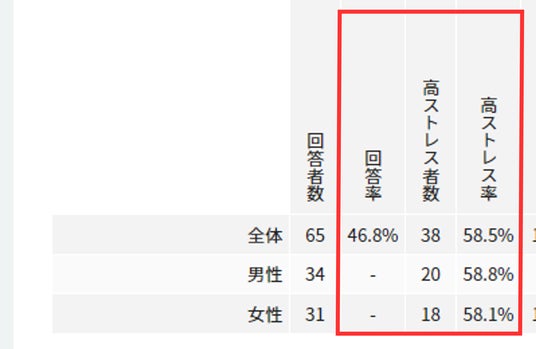 2.回答率、高ストレス者数、高ストレス率を表示:ストレスチェックの回答率と、厚生労働省の基準で高ストレス者として選定された人数、割合が表示されます。