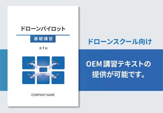 また、希望されるドローンスクール向けに「自社スクール名を記載したOEM講習テキスト」販売も行います。お問い合わせやお申し込みは以下URLより承ります。