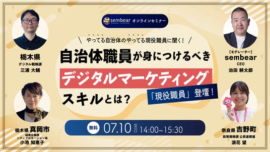 sembear合同会社(東京都渋谷区 CEO:治田耕太郎)は、2024年7月10日(水)に「今、身に着けるべき 自治体職員のデジタルマーケティングスキルとは」と題したウェビナーを開催致します。本ウェビナーでは、「選ばれる自治体」であるために自治体のデジタルマーケティングで活躍する皆様をゲストにお招きし、自治体におけるデジタルマーケティングにおいて求められる最低限のスキルを紐解きます。