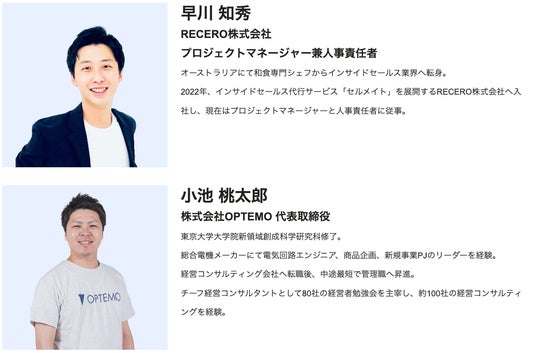 「アポイントを取らずにその場で商談する」セールステック”OPTEMO(オプテモ)”を開発、運営。B Dash Camp、TechCrunch Tokyoといった国内有数のピッチ大会へファイナリストとして選出され、IVS 2022 LaunchPad NAHAでは5位に入賞。「日本の商習慣を変える」という想いの下、新たなWEB体験を通じて「ヒト、コト、モノがさっとはまる」社会の実現を目指している。社名:株式会社OPTEMO