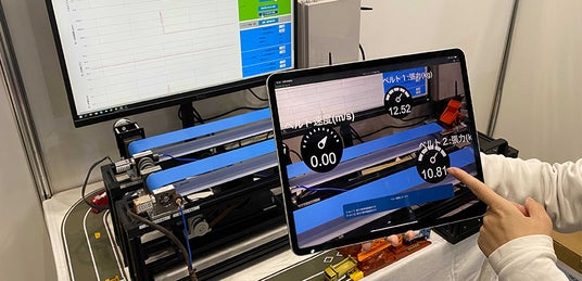 ミニチュアのベルトコンベアにセンサーを取り付けて、そこから出力される値をダッシュボードにリアルタイムで表示します。異常の予兆を検知した際に、現場のメンテナンス作業員に知らせるAR表示をご覧いただけます。