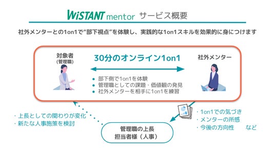 Wistantの社外メンターサービスでは、1on1の維持や質の向上のキーマンとなる管理職を対象に、社外の人材だからこそこれまでの経験や評価を気にせず本音を吐き出せる独特の関係性を用いた新しい人材育成のアプローチを提供しています。