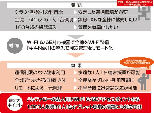 メルコホールディングス(東・名 6676)グループの株式会社バッファロー(本社:愛知県名古屋市、代表取締役社長:牧 寛之)の法人向けWi-Fi 6Eアクセスポイント「WAPM-AXETR」をはじめとするネットワーク関連機器4種が、学校法人 宮崎日本大学学園 宮崎日本大学中学校・高等学校(以下、宮崎日大学園中学校・高等学校)にて採用されたことを発表いたします。また本導入に関する事例を、当社Webページで公開いたしました。