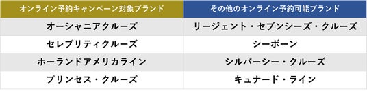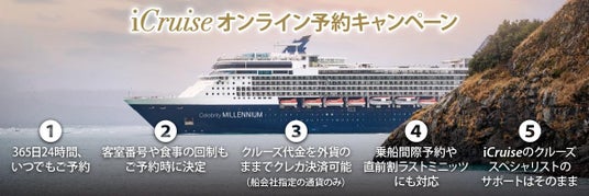 現在、オンライン予約キャンペーンを展開しているのは、オーシャニアクルーズ、セレブリティクルーズ、ホーランドアメリカライン、プリンセス・クルーズの4ブランドの、全コースを対象としており、海側バルコニー以上/7泊以上でのご利用が対象となります。様々な楽しみ方を提供しているクルーズだからこそ、寄港地観光・スパ・船内スペシャリティダイニング、船内ショッピングなど、オンボードクレジットも活用し、充実したクルーズのひと時をお過ごしください。オンライン予約キャンペーンについての詳細は、ホームページ専用ページもあわせてご欄ください。https://www.icruises.jp/feature/promotion.html