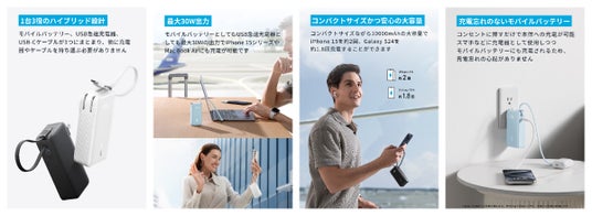 本製品は、販売開始当日にAmazon.co.jp売れ筋ランキング【携帯電話・スマートフォン用モバイルバッテリー】カテゴリにおいてベストセラーを獲得(※1)し、USB急速充電器とモバイルバッテリーにUSB-Cケーブルが一体となった「Anker Power Bank(30W, Fusion, Built-In USB-C ケーブル)」が、10000mAhの大容量に進化したモデルです。外出先でもiPhone 15を約2回充電が可能な他、USB急速充電器としても、モバイルバッテリーとしても最大30W出力に対応。スマートフォンへの急速充電はもちろん、MacBook Airにも充電が可能です。カラーは、ベーシックなブラック、ホワイトに加え、持ち物に合わせて選べるピンク、ブルー、パープルと全5色を展開し、お好きな色をお選びいただけます(※2)。モバイルバッテリーや充電器、ケーブルを本製品一台にまとめられるため、移動や出張の多いビジネスパーソンや旅行等のシチュエーションでも最適です。