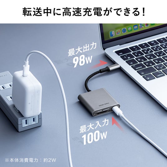 USB PD 100Wに対応しているので、パソコンやスマートフォンを充電しながらデータ転送ができます。大容量のデータを扱う際にも、充電切れを気にせずに作業を続けられます。
