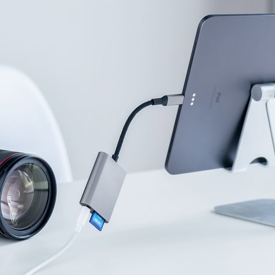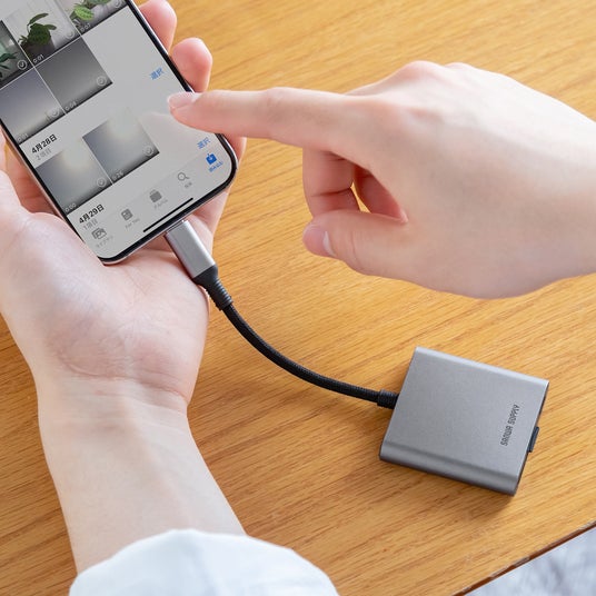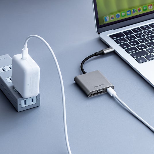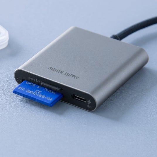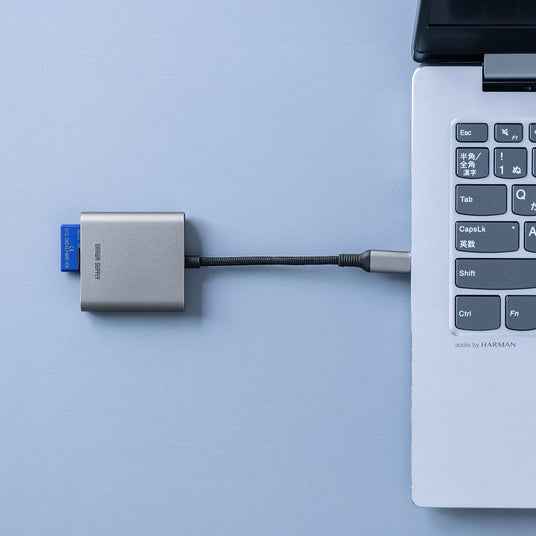 ノートパソコンやスマートフォンを充電できる。USB PD100Wの入力に対応した、USB Type-C接続のカードリーダー