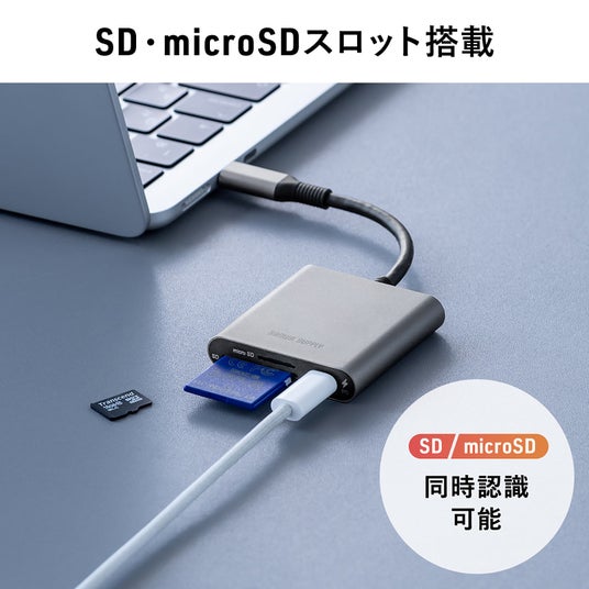SD、microSDのスロットを搭載し、同時認識が可能です。最大5Gbpsの超高速データ転送に対応しているので、大容量のデータも素早くやり取りできます。