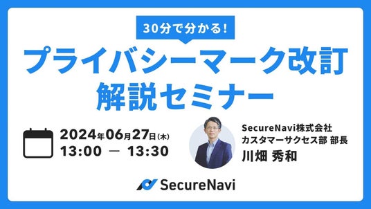 SecreNaviではプライバシーマークの改訂について、よりわかりやすく理解いただけるオンラインセミナー(無料)を開催します。「改訂で何が変わったのか?」「いつまでに何をすればよいのか?」などの疑問をお持ちの方は、ぜひご参加ください。