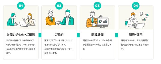 ■コミュニティ運営をフルプロデュース:300以上のオンラインビジネスを支援してきたノウハウを踏襲し、オンラインビジネスの運営をFANTS運営スタッフが行い、PDCAを回しながら最大化していきます。(※プランによっては対象外)