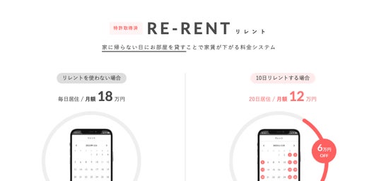 また、外泊すると家賃が下がる料金システム「リレント(Re-rent)」に対応したお部屋では、旅行や出張などで使わなかった日の家賃を節約することができます。