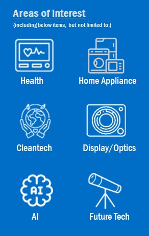 対象分野はスマートフォン、ウェアラブル、ディスプレイ、家電やヘルスケア、センサー、機能性材料、ロボットなど幅広く募集しており、Open Topicとしてそれ以外も領域でも応募可能です。