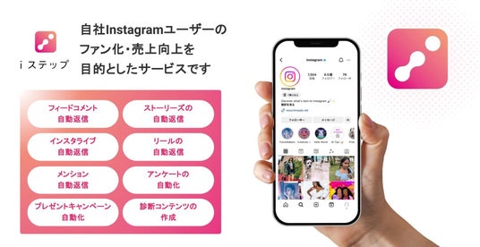 「iステップ」は、現在日本国内で4,500アカウント以上に導入いただいているInstagramの成果を加速させるダイレクトメッセージ(DM) チャットボットシステムです。24時間、自動で顧客対応を行うことが可能で、フォロワーとの双方向のコミュニケーションを可能にします。米Meta社よりInstagram公式APIの利用許諾を得ているため、利用規約違反やアカウント凍結の恐れは殆どありません。