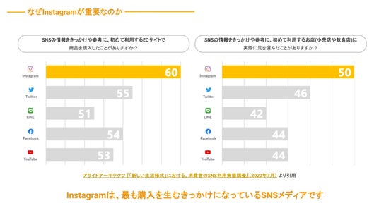 アライドアーキテクツ株式会社が2020年7月に実施した調査によると、50%の人がInstagramの情報をきっかけに初めて利用するお店に実際に足を運んだことがあります。他のSNSに比べてその割合は多く、Instagramは最も購入を生むきっかけになっているSNSメディアであると言えます。