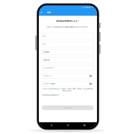 (セットアップは、二要素認証を採用し、組織情報や電子メール情報を含んだアカウント情報を作成し、当事者の電子メールの受信をもって「当事者の実在性」を確認する)