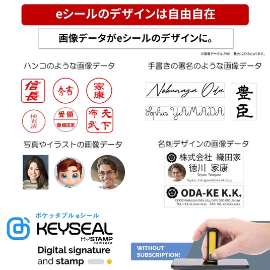 eシールのデザインは自由自在『ポケッタブルeシール KEYSEAL』は、PNG/JPGの画像ファイルを登録でき、eシールとして押印可能です。