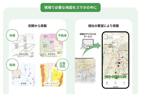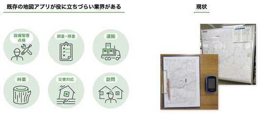 林業、インフラ・設備管理業、不動産業などでは専門性の高い地図が利用されますが、そういった地図のほとんどは一般的な地図アプリには掲載されておらず、webやPDFで提供されていたり、場合によっては紙のみで提供されていることも少なくありません。このような地図を用いる業務フローでは、準備に時間がかかること、可搬性や検索性が悪いこと、現在地との対応関係がわからないことなどから、現場業務が煩雑になる原因になっていました。また、その後工程においても、地図と大量の現地調査情報との照合に手間と時間がかかるといった問題もありました。