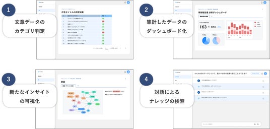 「AirLake」はあらゆる形式のデータを自動で構造化し、構造化したデータから新たなインサイトや価値を生み出します。問い合わせやアンケートの分析などに役立つ文章データのカテゴリ判定や、集計したデータのダッシュボード化、学習したデータを生成AIとのチャット形式で検索できるなど、膨大な情報を有効活用するための仕組みを備えています。