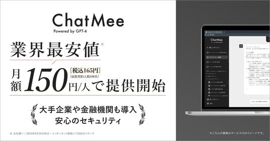 そのため、大手企業にも導入されているセキュアな環境が特徴の法人向けChatGPTプラットフォーム「ChatMee」をこれまでにない安価な価格で提供することで導入のハードルを下げ、ビジネス変革の一助を担うことができればと考えています。