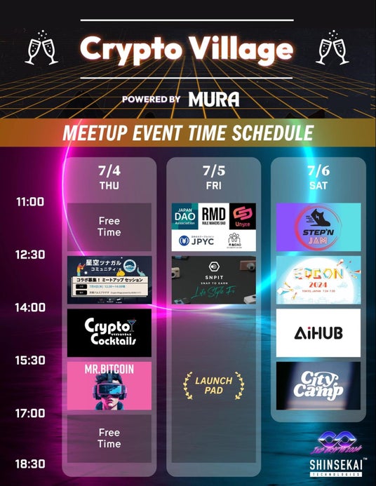 メインステージ近くのネットワーキングエリア「Crypto Village powered by MURA」では、登壇者と直接交流できる絶好の機会が提供さます。このエリアでは、JAPAN DAO Association、AiHUB、Crypto Cocktails、EDCONなど、日本やグローバル知名なクリプトコミュニティのメンバーと会えます。また、クラフトコーラやクラフトジンジャーエールを無料で楽しみながら、会話を楽しむことができます。