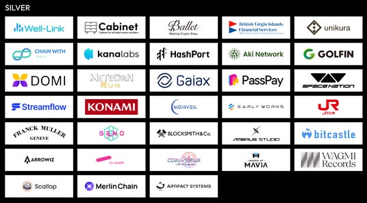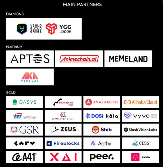 プラチナスポンサーには、Aptos、Animechain.ai、AKA Virtual、Memelandが含まれます。ゴールドスポンサーには、Oasys、double jump.tokyo、Avalanche、Alibaba Cloud、Japan Open Chain、SBI Holdings、LINE NEXT/DOSI/Kaia、Vyvo Smart Chain、GSR、Zeus Network、Shib.io、Slash Vision Labs、CARV、Fireblocks、Aethir、CESS Network、A41、XAI、Peer、Xsollaが名を連ねています。