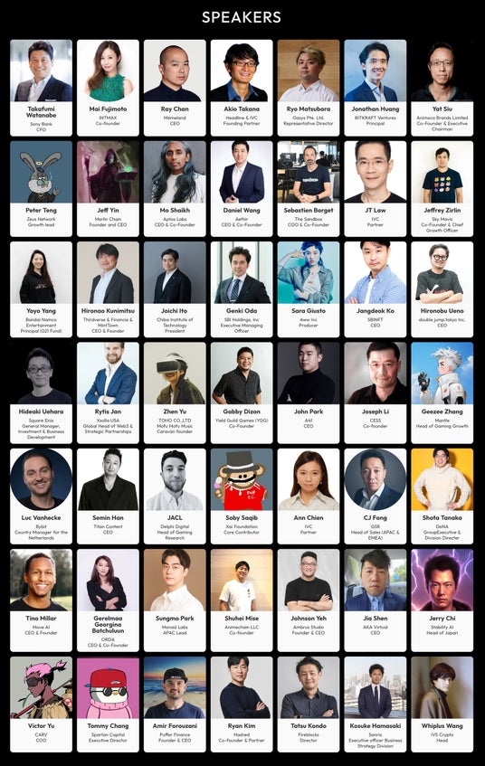 また、AptosのMo Shaikh、Animoca BrandsのYat Siu、MemelandのRay Chan、The SandboxのSebastien Borget、YGGのGabby Dizonなど、国際的に著名なスピーカーが登壇し、グローバルWeb3プレイヤーと日本企業の協力方法や成功事例を紹介します。
