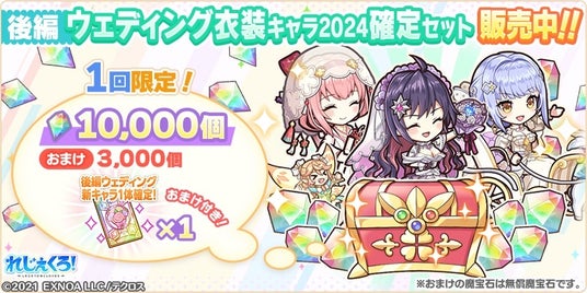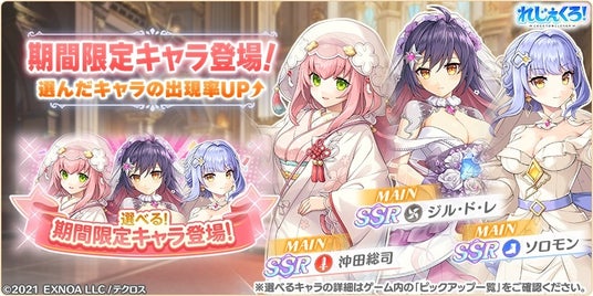 合同会社EXNOA(本社:東京都港区、CEO:村中 悠介、URL:https://games.dmm.com/)が運営するDMM GAMESにおいて、真の英雄となる王道ファンタジー『れじぇくろ!~レジェンド・クローバー~』(https://www.legend-clover.net/)にて、ウェディング衣装に着替えた「ジル・ド・レ」「沖田総司」「ソロモン」が期間限定で新たに登場!さらに、イベント「積み重ねた愛が花をひらく・後編」が開催!