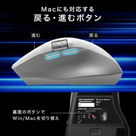 Windows/Mac切替えボタンにより、Macでも「戻る」「進む」ボタンに対応します。静かな場所でも気にせず使用できる静音ボタンを採用しています。