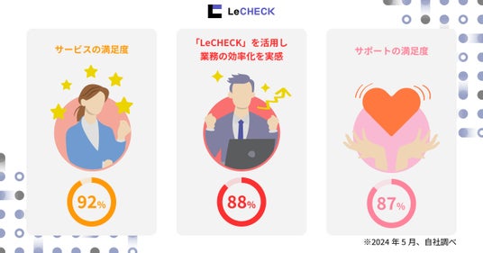 「LeCHECK」を利用している企業のサービス満足度92%、効率化の実感88%、サポート満足度87%となりました。
