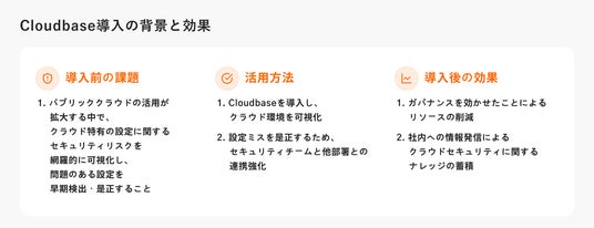 また、「Cloudbase」から提供されるドキュメントやサポートを活用することで、個々の運用者が自身でセキュリティ課題を解決しやすくなったことから、全体運用の負荷が低減されている他、パブリッククラウドのリスク状況をよりわかりやすく把握できるようになったことで、更なるガバナンスの強化が実現しています。